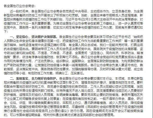 意見指出,各全國性行業(yè)協(xié)會商會要加強對本行業(yè)、本領域、本單位新型冠狀病毒肺炎疫情防治知識的宣傳教育和正面引導工作,增強自我防護意識,掌握自我防范本領。在疫情得到有效控制之前,一般不得舉辦年會、展會、研討會、論壇、講座、培訓等各類聚集性活動,采取網(wǎng)上辦公、通訊聯(lián)絡等措施,減少人員流動,降低疫情發(fā)生風險。疫情防控期間相關登記管理服務事項,盡量按照《民政部社會組織管理局關于在疫情防控期推行全國性社會組織政務服務網(wǎng)上辦理的倡議》進行辦理。因在疫情期間無法召開會議不能按期換屆的,可以書面申請延期換屆。