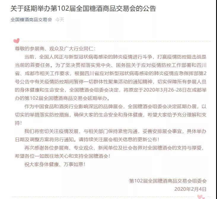 第102屆春季全國糖酒商品交易會原定于3月26-28日在成都舉辦,現(xiàn)已確定日期延后,具體時間另行通知。