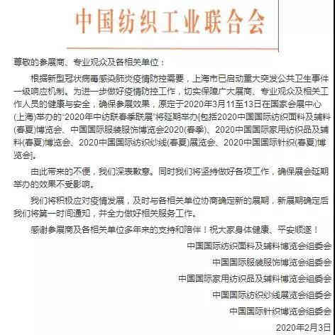 2020年中紡聯(lián)春季聯(lián)展將延期舉辦,原定于3月11-13日在國家會展中心(上海)舉辦的。