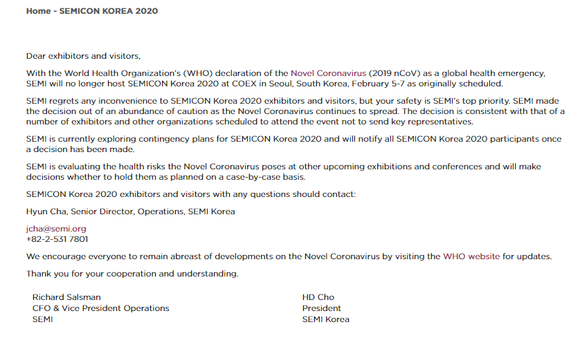 原定于3月18-20日在上海新國際博覽中心舉辦的“SEMICON China 2020國際半導體展” 與原定于2月5日至7日在韓國COEX首爾會議中心舉辦的韓國首爾國際半導體工業技術展覽會(SEMICON Korea 2020)宣布延期舉辦。具體時間安排將另行通知。